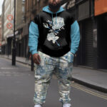 This men’s two-piece set is a go-to for looking sharp without trying hard! It features a cool black hoodie with rose prints and blue color-blocked sleeves. The matching blue floral print pants make it a complete look that’s both stylish and easy to wear. Made from high-quality fabric, it’s super comfy and perfect for any occasion.