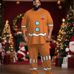 Big & Tall Men’s Christmas Gingerbread Man Cosplay Printed Long Sleeve T-Shirt Trousers Suit