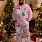 Big & Tall Men’s Santa Claus Cartoon Pink Printed Long Sleeve T-Shirt Pants Set