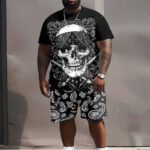 Men’s Big and Tall Street Hip Hop Skull Paisley Print T-Shirt Shorts Set