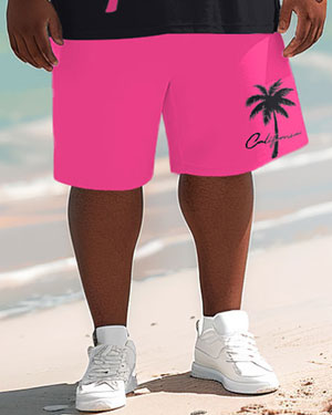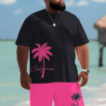 Don’t miss this Hawaiian men’s big and tall T-shirt and shorts set. With a rose-red coconut tree print and simple letter, this set is classic and versatile. The contrasting design of black and rose-red is full of visual impact, making you shine in the crowd. It can add a touch of bright color to your summer look.