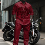 Who said men can’t pull off red? This set brings you a new style. The red set is printed with black vintage floral prints, giving it a retro feel. Whether it’s a casual or business style, this set is well-designed to be worn perfectly. It’s simple in design while ensuring comfort and freedom of movement.