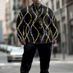 The men’s plus size suit features a gold and silver color blocking for a sparkling and eye-catching look. Glitter prints all over the long sleeve shirt and pants create a luxurious yet chic vibe. The shirt is exquisitely tailored with elegant long sleeves and the pants have a loose fit that combines comfort and personality, allowing men to be the center of attention and look unique in all occasions.
