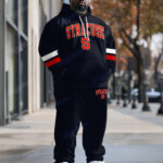This men’s plus size hoodie set features Syracuse University style. The striped colour block design is stylish and vibrant. The hood is practical and aesthetically pleasing, and the fit is relaxed. The print on the body incorporates elements of the university, highlighting the campus culture. The fine details and unique colour scheme make it comfortable to wear and show off a man’s athleisure personality.