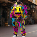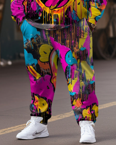 This men’s hoodie and pants set is cut to fit and feel comfortable. The fashionable face graffiti elements and colorful patterns make the clothing more personalized and attractive, allowing you to show a fashionable style. Featuring street fashion, it is very suitable for casual occasions.