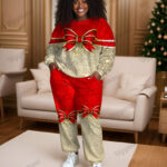 Women Plus Size Christmas Rhinestone Gift box Print Pants Suit