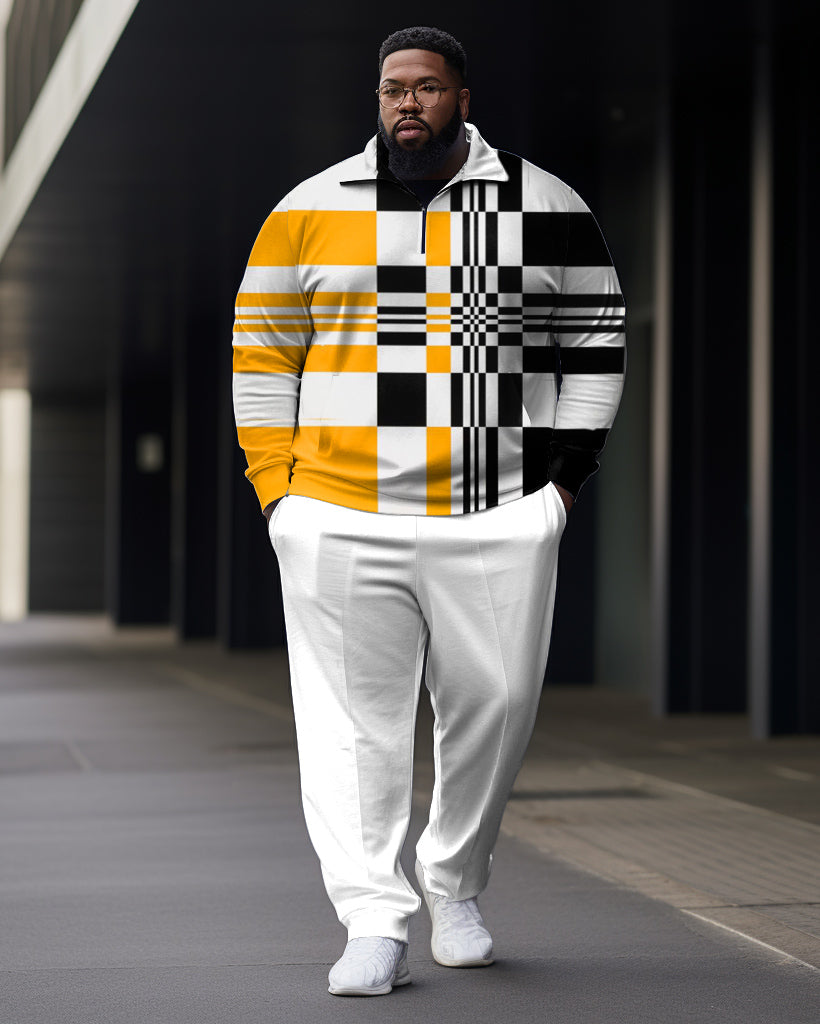 $45.00 – $86.00Price range: $45.00 through $86.00Description This men’s big and tall two-piece set boasts a unique design. Designed for a relaxed fit, this outfit is versatile and comfy. The white theme is enhanced by a plaid design, featuring a striking mix of yellow and black check patterns. With a convenient zip collar, every detail is…